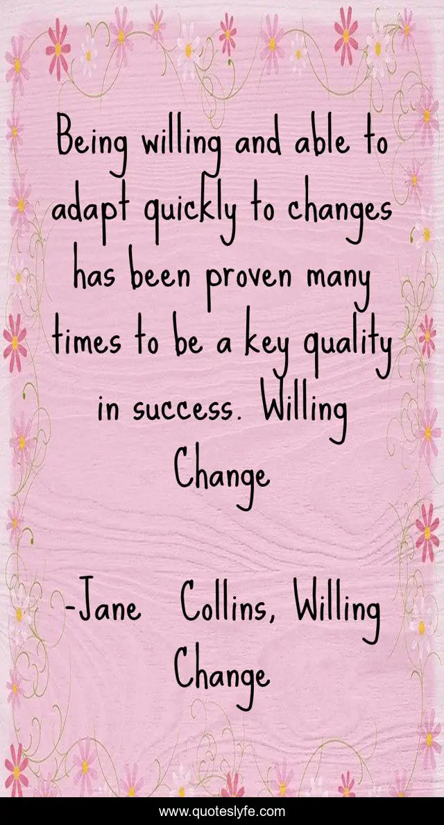 This page presents the quote "Being willing and able to adapt quickly to changes has been proven many times to be a key quality in success. Willing Change". Author of this quote is Jane Collins, Willing Change. .