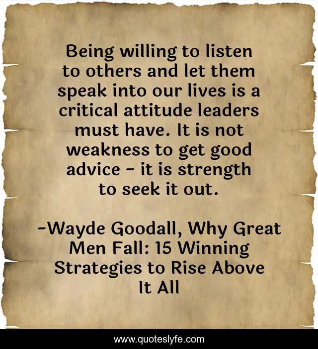 This page presents the quote "Being willing to listen to others and let them speak into our lives is a critical attitude leaders must have. It is not weakness to get good advice - it is strength to seek it out.". Author of this quote is Wayde Goodall, Why Great Men Fall: 15 Winning Strategies to Rise Above It All. This quote is about behaviour, attitude, leadership,.