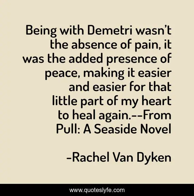 This page presents the quote "Being with Demetri wasn’t the absence of pain, it was the added presence of peace, making it easier and easier for that little part of my heart to heal again.--From Pull: A Seaside Novel". Author of this quote is Rachel Van Dyken. This quote is about new-adult-romance, pull, tear-a-seaside-novel, contemporary-romance,.
