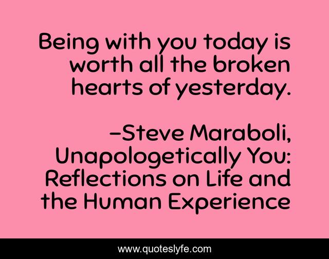 This page presents the quote "Being with you today is worth all the broken hearts of yesterday.". Author of this quote is Steve Maraboli, Unapologetically You: Reflections on Life and the Human Experience. This quote is about broken-heart, relationships, life, love, affection, true-love,.