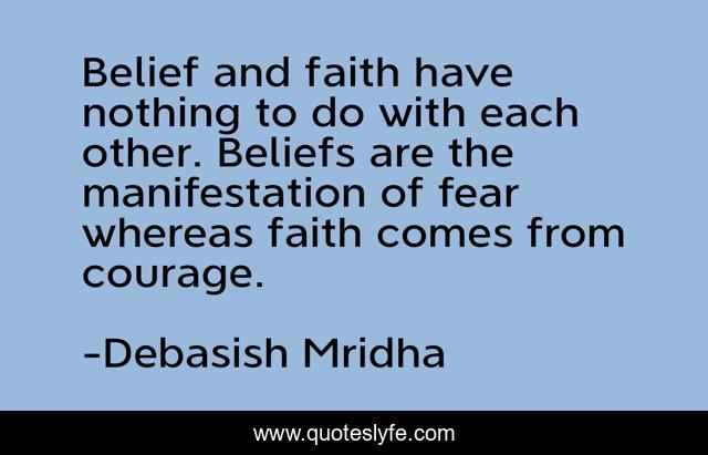 This page presents the quote "Belief and faith have nothing to do with each other. Beliefs are the manifestation of fear whereas faith comes from courage.". Author of this quote is Debasish Mridha. This quote is about what-are-beliefs, belief-and-faith, what-is-faith, manifestation-of-fear, philosophy, debasish-mridha, quotes, debasish-mridha-md, inspirational,.