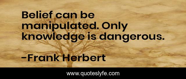 This page presents the quote "Belief can be manipulated. Only knowledge is dangerous.". Author of this quote is Frank Herbert. This quote is about knowledge, truth, manipulation, kindlehighlight, propoganda, belief,.