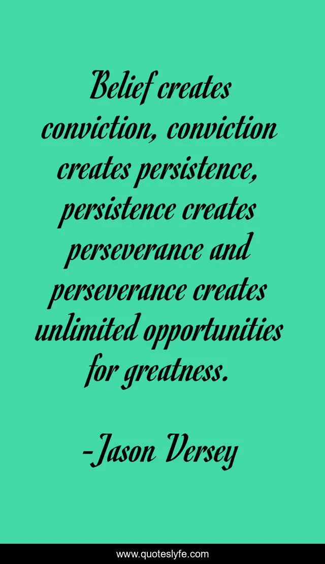 This page presents the quote "Belief creates conviction, conviction creates persistence, persistence creates perseverance and perseverance creates unlimited opportunities for greatness.". Author of this quote is Jason Versey. .