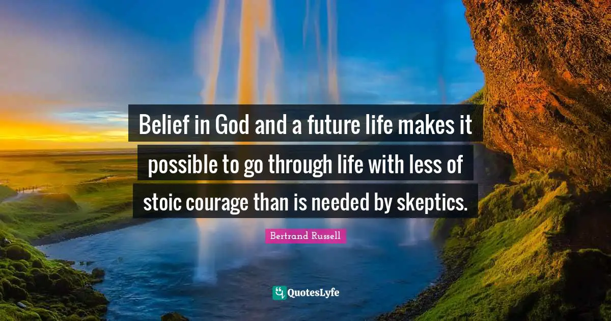 This page presents the quote "Belief in God and a future life makes it possible to go through life with less of stoic courage than is needed by skeptics.". Author of this quote is Bertrand Russell. This quote is about courage, future life, skeptic, life, belief, belief in god, stoic, needed,.