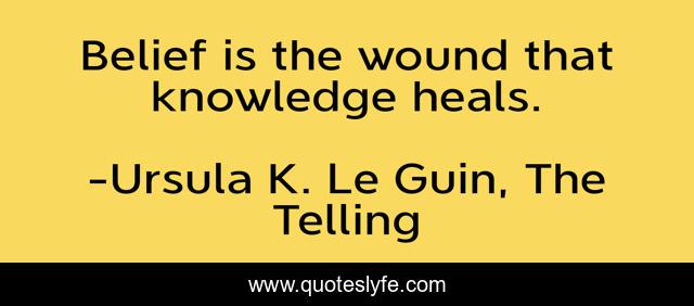 This page presents the quote "Belief is the wound that knowledge heals.". Author of this quote is Ursula K. Le Guin, The Telling. This quote is about belief, knowledge,.