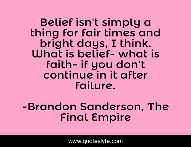 This page presents the quote "Belief isn't simply a thing for fair times and bright days, I think. What is belief- what is faith- if you don't continue in it after failure.". Author of this quote is Brandon Sanderson, The Final Empire. This quote is about faith, belief, hope,.