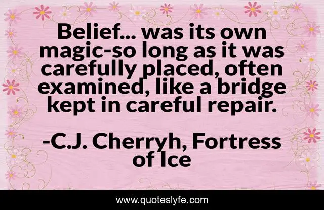 This page presents the quote "Belief... was its own magic-so long as it was carefully placed, often examined, like a bridge kept in careful repair.". Author of this quote is C.J. Cherryh, Fortress of Ice. .