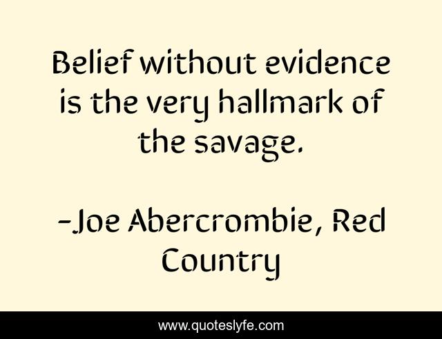 This page presents the quote "Belief without evidence is the very hallmark of the savage.". Author of this quote is Joe Abercrombie, Red Country. This quote is about faith, cosca, belief,.