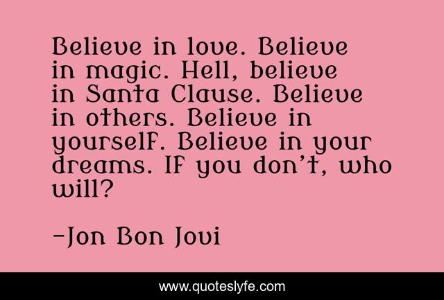 This page presents the quote "Believe in love. Believe in magic. Hell, believe in Santa Clause. Believe in others. Believe in yourself. Believe in your dreams. If you don’t, who will?". Author of this quote is Jon Bon Jovi. This quote is about santa-claus, believe, magic, dreams,.
