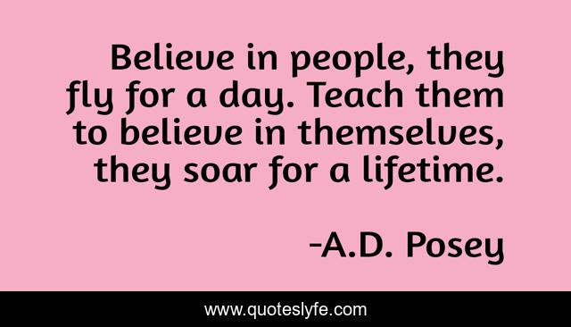 This page presents the quote "Believe in people, they fly for a day. Teach them to believe in themselves, they soar for a lifetime.". Author of this quote is A.D. Posey. This quote is about fly, peace, love, inspirational, ad-posey, flying, screenwriters, quotes, writers,.