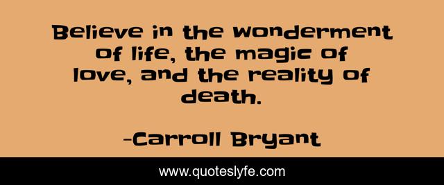 This page presents the quote "Believe in the wonderment of life, the magic of love, and the reality of death.". Author of this quote is Carroll Bryant. This quote is about life-lesson, philosophy, live-now, philisophical, philisophical-love, philisophical-life,.