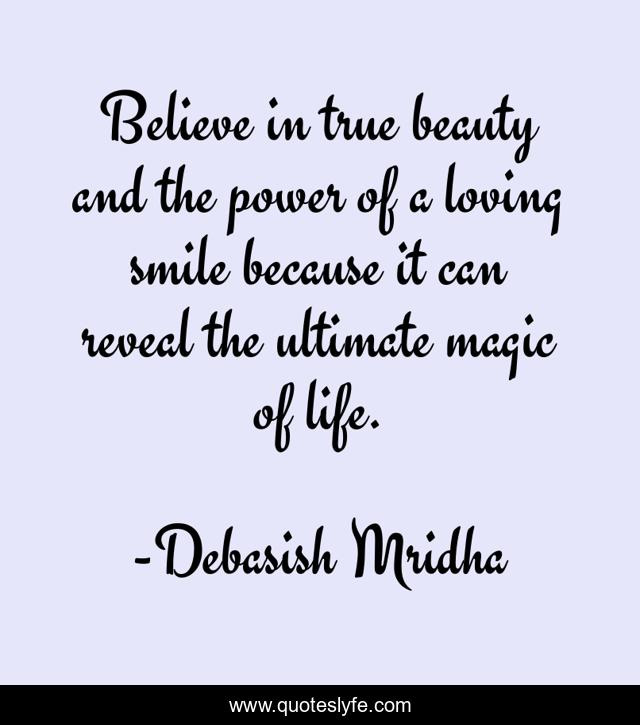 This page presents the quote "Believe in true beauty and the power of a loving smile because it can reveal the ultimate magic of life.". Author of this quote is Debasish Mridha. This quote is about power-of-a-smile, magic-of-life, philosophy, debasish-mridha, true-beauty, quotes, power-of-a-loving-smile, debasish-mridha-md, inspirational,.