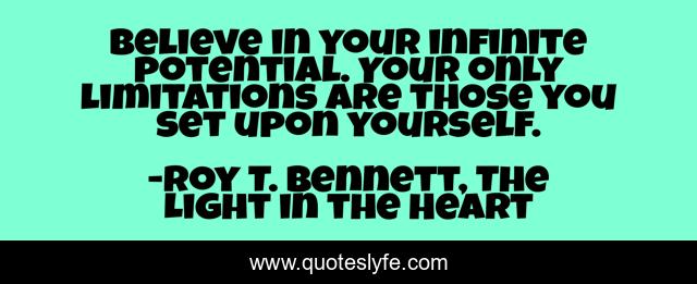 This page presents the quote "Believe in your infinite potential. Your only limitations are those you set upon yourself.". Author of this quote is Roy T. Bennett, The Light in the Heart. This quote is about motivation, inspire, believe-in-yourself, optimistic, living, inspiring, positive, positive-thinking, spirituality,.