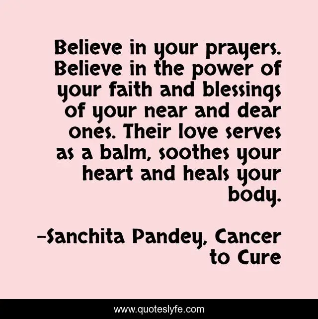 This page presents the quote "Believe in your prayers. Believe in the power of your faith and blessings of your near and dear ones. Their love serves as a balm, soothes your heart and heals your body.". Author of this quote is Sanchita Pandey, Cancer to Cure. This quote is about faith, love, treatment, prayer, cancer-patients, affection, healing,.