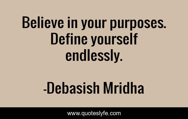 This page presents the quote "Believe in your purposes. Define yourself endlessly.". Author of this quote is Debasish Mridha. This quote is about philosophy, debasish-mridha, quotes, inspirational, enthusiasm, define-yourself, believe-in-your-purposes, debasish-mridha-m-d,.