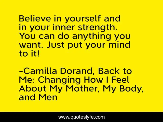 This page presents the quote "Believe in yourself and in your inner strength. You can do anything you want. Just put your mind to it!". Author of this quote is Camilla Dorand, Back to Me: Changing How I Feel About My Mother, My Body, and Men. This quote is about gratitude, inner-strength, change-your-life, inspiration,.