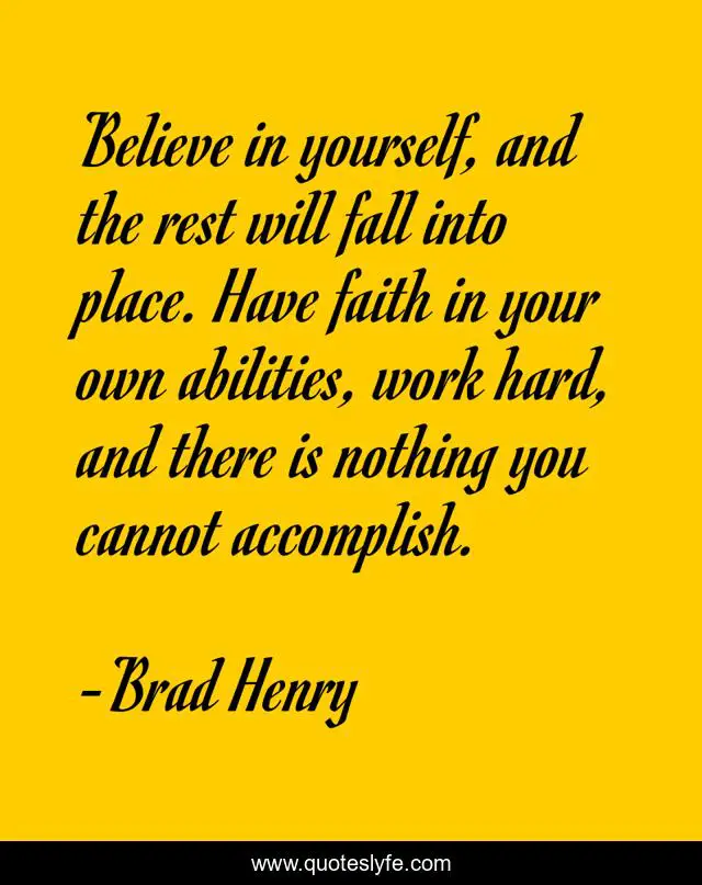 This page presents the quote "Believe in yourself, and the rest will fall into place. Have faith in your own abilities, work hard, and there is nothing you cannot accomplish.". Author of this quote is Brad Henry. This quote is about faith, work hard,.
