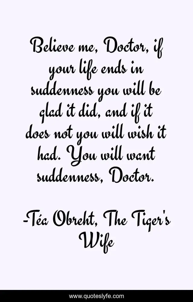 This page presents the quote "Believe me, Doctor, if your life ends in suddenness you will be glad it did, and if it does not you will wish it had. You will want suddenness, Doctor.". Author of this quote is Téa Obreht, The Tiger's Wife. .