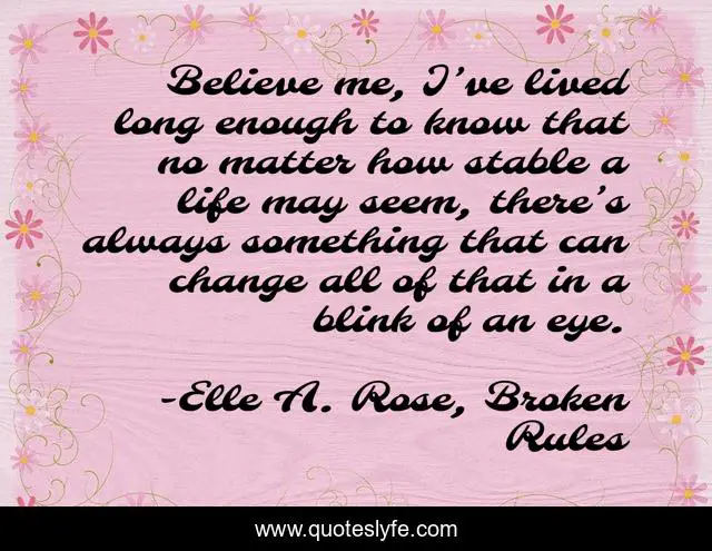 This page presents the quote "Believe me, I’ve lived long enough to know that no matter how stable a life may seem, there’s always something that can change all of that in a blink of an eye.". Author of this quote is Elle A. Rose, Broken Rules. This quote is about ya, vampire, amber-harris,.