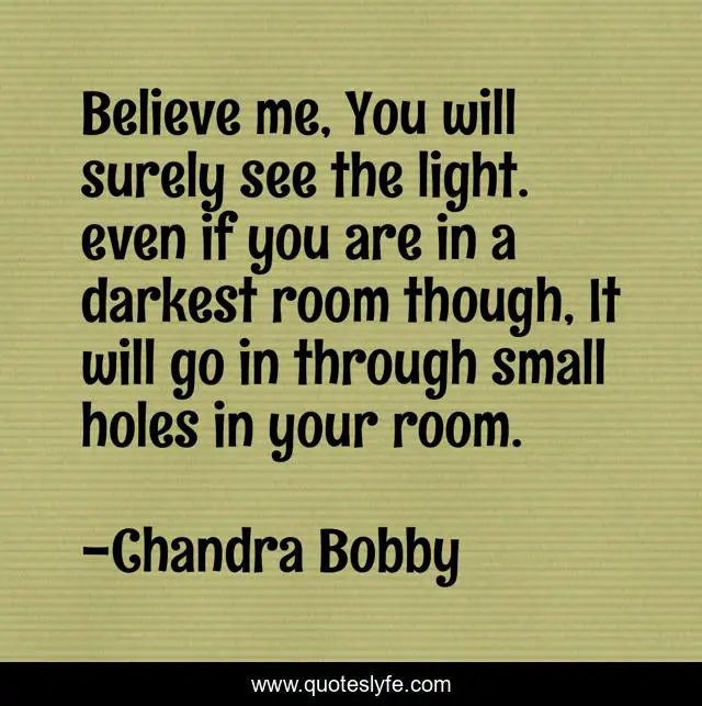 This page presents the quote "Believe me, You will surely see the light. even if you are in a darkest room though, It will go in through small holes in your room.". Author of this quote is Chandra Bobby. This quote is about confidence, positive, motivational, live, optimistic, inspirational, enthusiasm,.