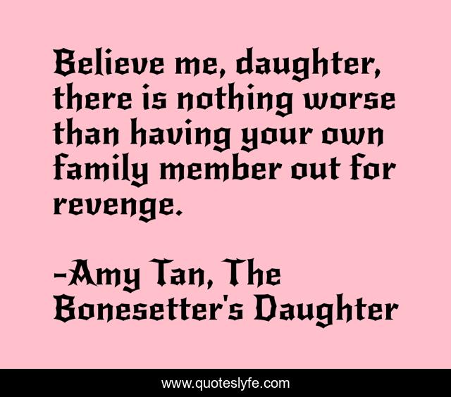This page presents the quote "Believe me, daughter, there is nothing worse than having your own family member out for revenge.". Author of this quote is Amy Tan, The Bonesetter's Daughter. This quote is about family, fate, revenge,.