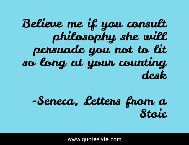 This page presents the quote "Believe me if you consult philosophy she will persuade you not to lit so long at your counting desk". Author of this quote is Seneca, Letters from a Stoic. .