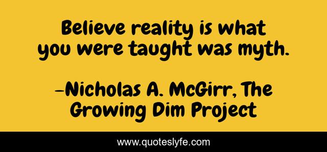 This page presents the quote "Believe reality is what you were taught was myth.". Author of this quote is Nicholas A. McGirr, The Growing Dim Project. This quote is about mythology, believe, myth, reality,.