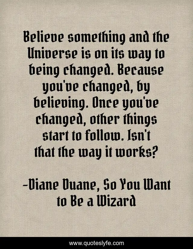 This page presents the quote "Believe something and the Universe is on its way to being changed. Because you've changed, by believing. Once you've changed, other things start to follow. Isn't that the way it works?". Author of this quote is Diane Duane, So You Want to Be a Wizard. This quote is about faith, life, magic, belief, universe, change,.