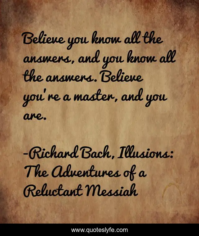 This page presents the quote "Believe you know all the answers, and you know all the answers. Believe you're a master, and you are.". Author of this quote is Richard Bach, Illusions: The Adventures of a Reluctant Messiah. This quote is about believe, richard-bach,.