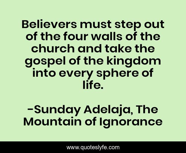 This page presents the quote "Believers must step out of the four walls of the church and take the gospel of the kingdom into every sphere of life.". Author of this quote is Sunday Adelaja, The Mountain of Ignorance. This quote is about kingdom, mountain, life, darkness, power, danger, believers, light, people,.