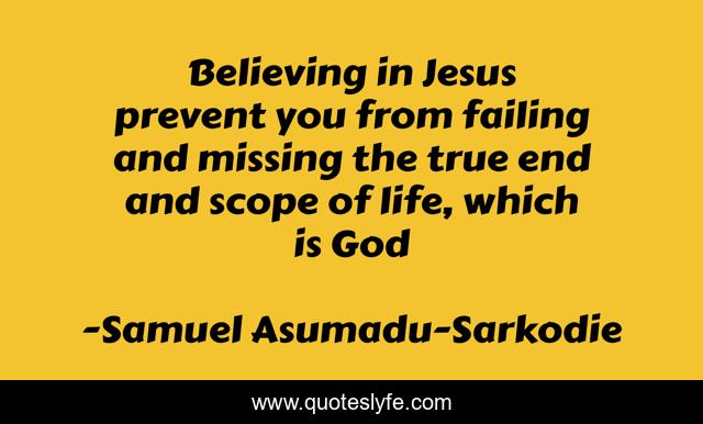 This page presents the quote "Believing in Jesus prevent you from failing and missing the true end and scope of life, which is God". Author of this quote is Samuel Asumadu-Sarkodie. This quote is about proverbs, words-of-knowledge, discernment, parables, words-of-wisdom, inspiration,.