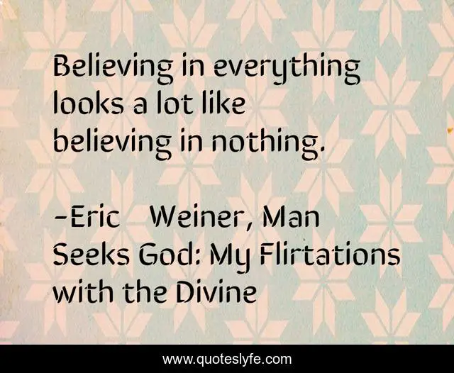"Eric Weiner, Man Seeks God: My Flirtations with the Divine Quotes." Quoteslyfe.com, 2025. Mon. 08 Dec. 2025. <https://www.quoteslyfe.com/quote/Believing-in-everything-looks-a-lot-like-111619>.
