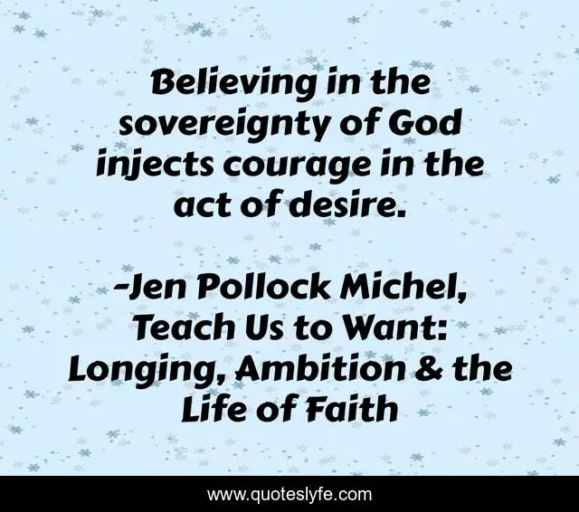 This page presents the quote "Believing in the sovereignty of God injects courage in the act of desire.". Author of this quote is Jen Pollock Michel, Teach Us to Want: Longing, Ambition & the Life of Faith. This quote is about faith, disappointment,.