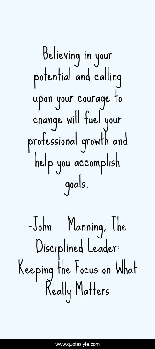 This page presents the quote "Believing in your potential and calling upon your courage to change will fuel your professional growth and help you accomplish goals.". Author of this quote is John Manning, The Disciplined Leader: Keeping the Focus on What Really Matters. This quote is about courage, leadership-development, calling, potential, goals, professional-growth,.