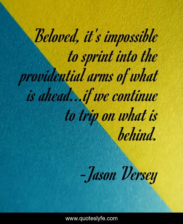 This page presents the quote "Beloved, it's impossible to sprint into the providential arms of what is ahead...if we continue to trip on what is behind.". Author of this quote is Jason Versey. This quote is about forgiveness, moving-forward, perseverance,.