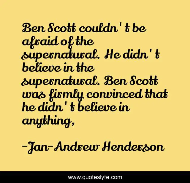 This page presents the quote "Ben Scott couldn't be afraid of the supernatural. He didn't believe in the supernatural. Ben Scott was firmly convinced that he didn't believe in anything, ". Author of this quote is Jan-Andrew Henderson. This quote is about denial, supernatural,.