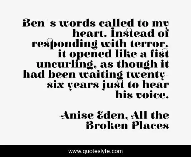 This page presents the quote "Ben's words called to my heart. Instead of responding with terror, it opened like a fist uncurling, as though it had been waiting twenty-six years just to hear his voice.". Author of this quote is Anise Eden, All the Broken Places. This quote is about falling-in-love, love, affection,.