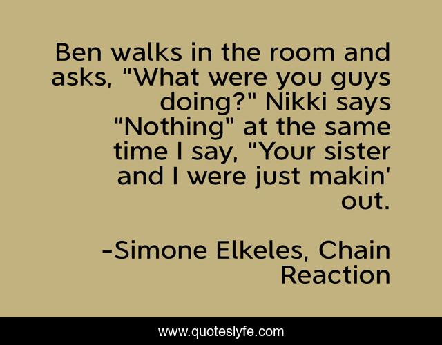 This page presents the quote "Ben walks in the room and asks, “What were you guys doing?” Nikki says “Nothing” at the same time I say, “Your sister and I were just makin’ out.". Author of this quote is Simone Elkeles, Chain Reaction. This quote is about funny, humour, young-adult-romance, romance, young-adult-fiction, comedy,.