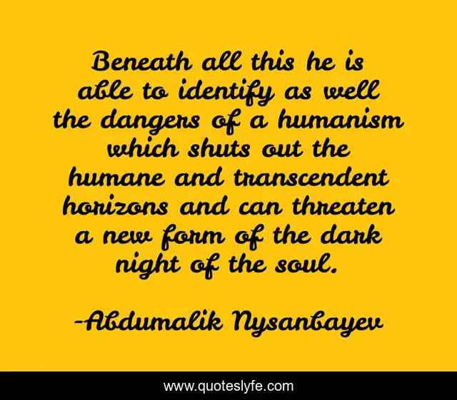 This page presents the quote "Beneath all this he is able to identify as well the dangers of a humanism which shuts out the humane and transcendent horizons and can threaten a new form of the dark night of the soul.". Author of this quote is Abdumalik Nysanbayev. This quote is about cultural, history, political, social,.