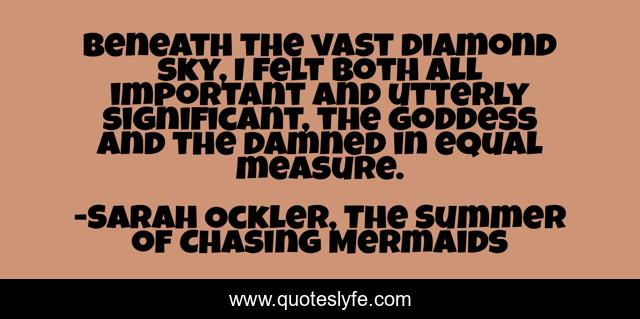This page presents the quote "Beneath the vast diamond sky, I felt both all important and utterly significant, the goddess and the damned in equal measure.". Author of this quote is Sarah Ockler, The Summer of Chasing Mermaids. .