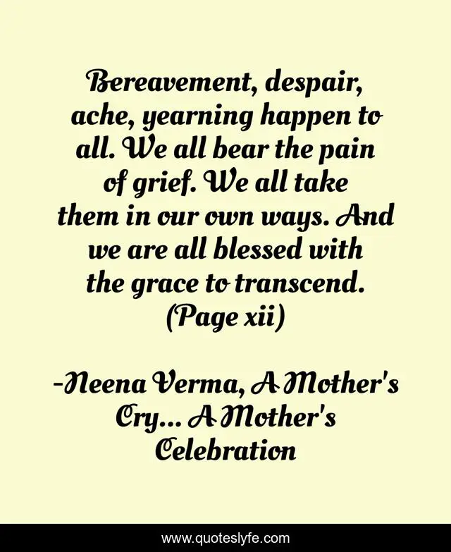 This page presents the quote "Bereavement, despair, ache, yearning happen to all. We all bear the pain of grief. We all take them in our own ways. And we are all blessed with the grace to transcend. (Page xii)". Author of this quote is Neena Verma, A Mother's Cry... A Mother's Celebration. This quote is about grief, transcend, grace,.