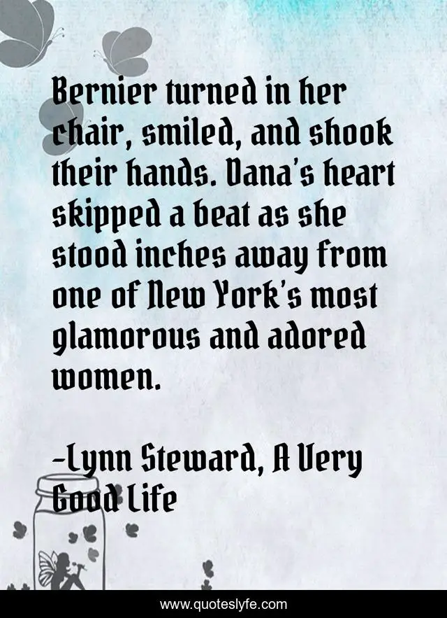 This page presents the quote "Bernier turned in her chair, smiled, and shook their hands. Dana’s heart skipped a beat as she stood inches away from one of New York’s most glamorous and adored women.". Author of this quote is Lynn Steward, A Very Good Life. This quote is about rosamond-bernier, a-very-good-life, new-york-city, lynn-steward,.