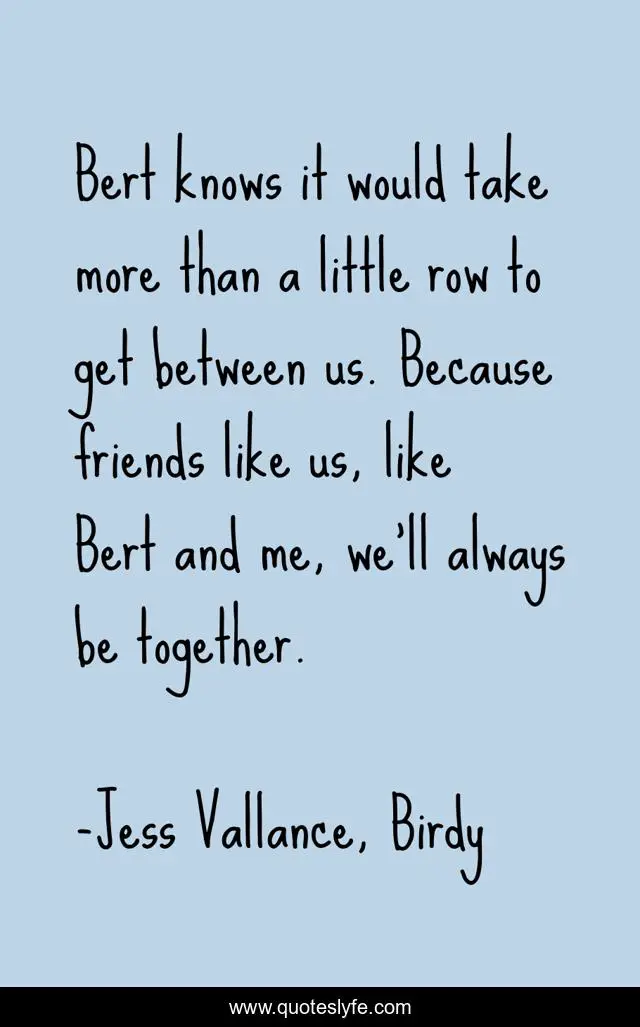 This page presents the quote "Bert knows it would take more than a little row to get between us. Because friends like us, like Bert and me, we'll always be together.". Author of this quote is Jess Vallance, Birdy. .