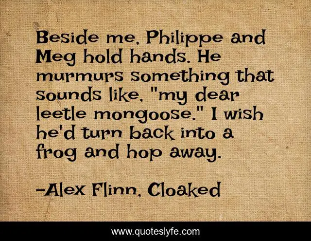 This page presents the quote "Beside me, Philippe and Meg hold hands. He murmurs something that sounds like, "my dear leetle mongoose." I wish he'd turn back into a frog and hop away.". Author of this quote is Alex Flinn, Cloaked. This quote is about funny, comedy, funny-humor,.