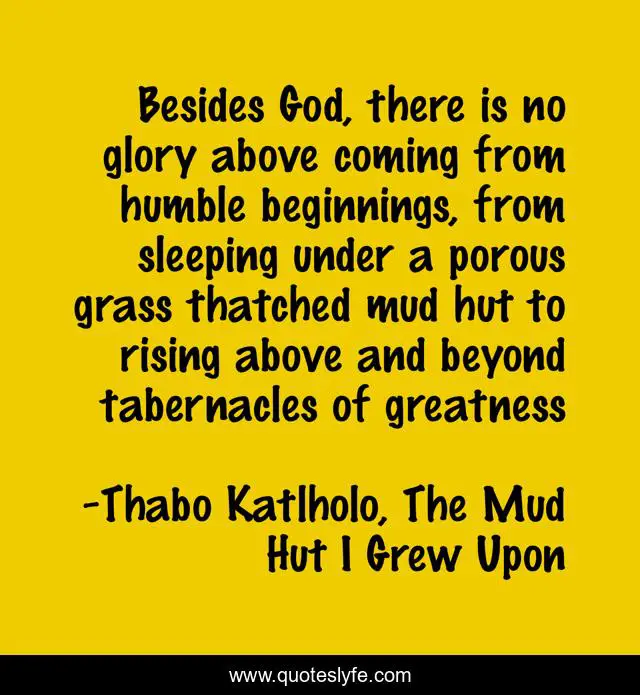 This page presents the quote "Besides God, there is no glory above coming from humble beginnings, from sleeping under a porous grass thatched mud hut to rising above and beyond tabernacles of greatness". Author of this quote is Thabo Katlholo, The Mud Hut I Grew Upon. This quote is about greatness, god, humble-beginnings, mud-huts,.