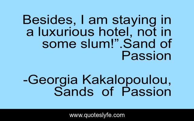 This page presents the quote "Besides, I am staying in a luxurious hotel, not in some slum!”.Sand of Passion". Author of this quote is Georgia Kakalopoulou, Sands of Passion. This quote is about passion, adventure, danger,.