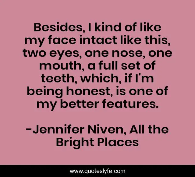 This page presents the quote "Besides, I kind of like my face intact like this, two eyes, one nose, one mouth, a full set of teeth, which, if I'm being honest, is one of my better features.". Author of this quote is Jennifer Niven, All the Bright Places. This quote is about ya, atbp, humor,.