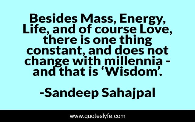 This page presents the quote "Besides Mass, Energy, Life, and of course Love, there is one thing constant, and does not change with millennia - and that is ‘Wisdom’.". Author of this quote is Sandeep Sahajpal. .