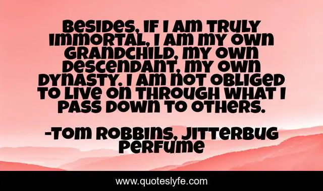 This page presents the quote "Besides, if I am truly immortal, I am my own grandchild, my own descendant, my own dynasty. I am not obliged to live on through what I pass down to others.". Author of this quote is Tom Robbins, Jitterbug Perfume. .
