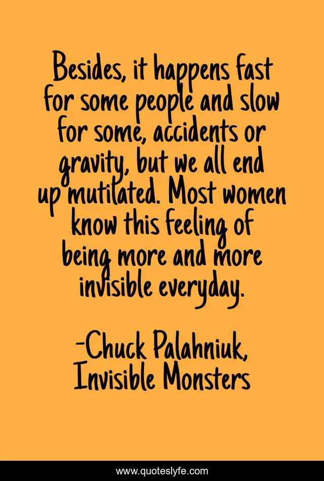 This page presents the quote "Besides, it happens fast for some people and slow for some, accidents or gravity, but we all end up mutilated. Most women know this feeling of being more and more invisible everyday.". Author of this quote is Chuck Palahniuk, Invisible Monsters. This quote is about aging, beauty,.